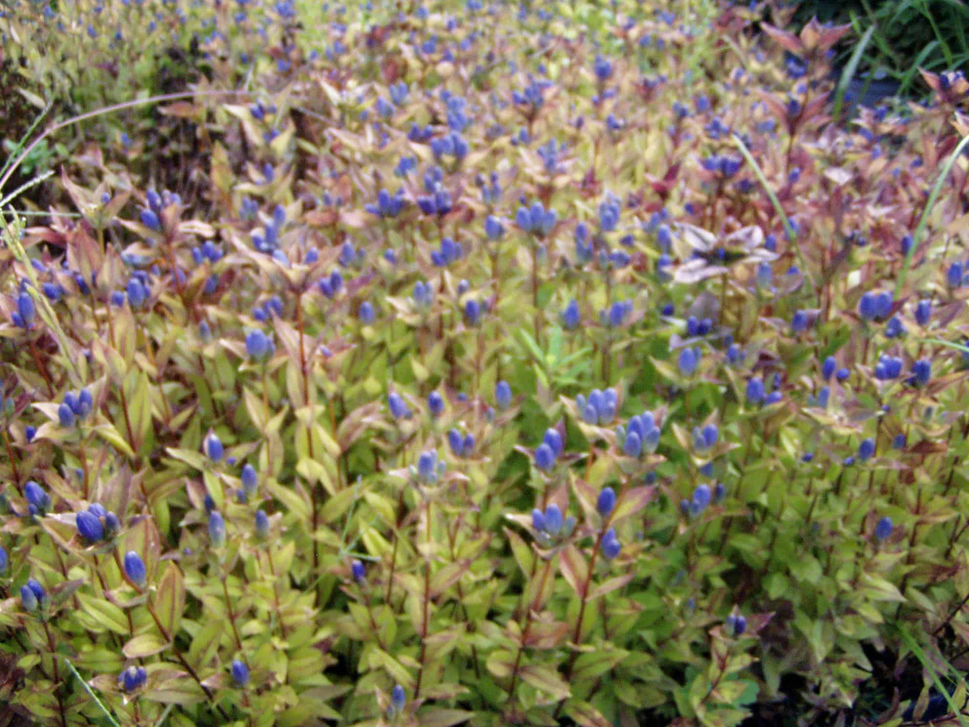 A perennial herbaceous plant native to North America. It is recognized for its unique, closed, bottle-shaped blue-purple flowers that remain sealed until pollinated by bumblebees strong enough to pry them open. Found in moist woods and meadows, often along bodies of water, bottle gentian blooms from late summer into early fall, adding a splash of color and intrigue to natural landscapes. Foliage and roots are bitter tasting, so herbivores often do not decimate it.