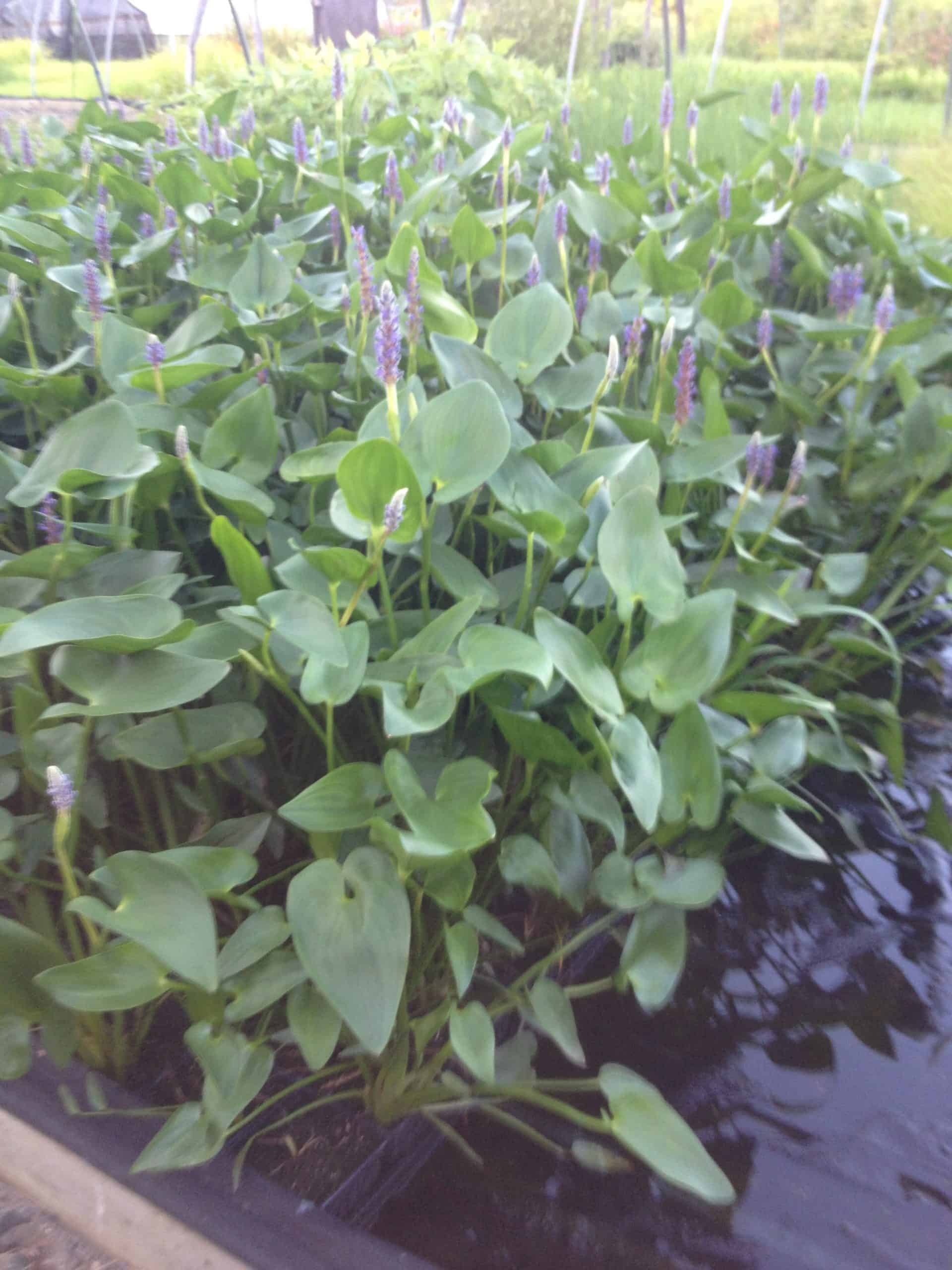 A perennial aquatic plant native to North America. It features glossy, heart-shaped leaves that rise above the water on stout stalks, supporting spikes of lavender-blue flowers in summer. Found in shallow waters of ponds, lakes, and slow-moving streams, pickerelweed provides habitat for aquatic wildlife and adds visual interest with its vibrant blooms. Excellent for uptake of dissolved phosphorus. Attracts some bees/pollinators.