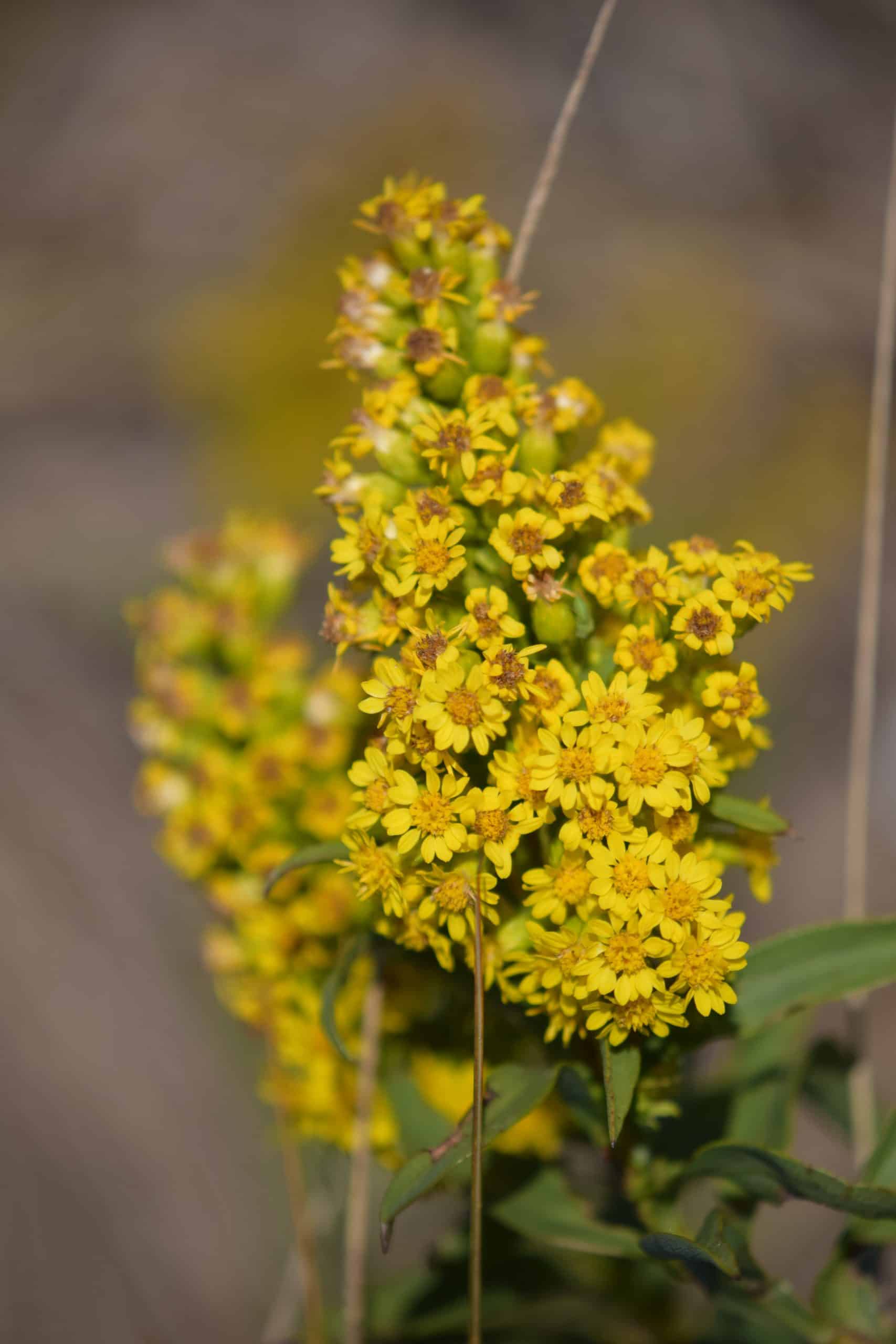 Growing 1-6'. Clusters of small yellow compound flowers bloom from August to November, and the dried flower heads may persist into winter. Leaves grow along the entire stem, alternate and lance shaped, with entire edges (unusual for the Solidago genus).